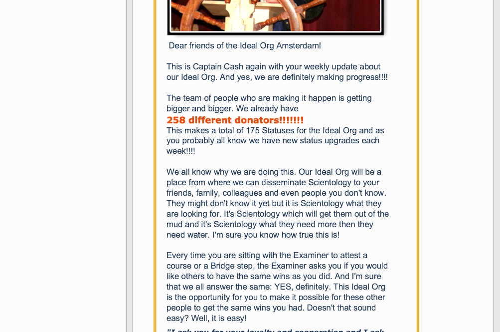 De Nederlandse donaties zijn daarbij geïdentificeerd aan de hand van de lijst donateurs voor de Amsterdamse Ideale Org. Tot 2010 is ongeveer 7 ton gedoneerd, jaarlijks ongeveer een halve ton. In november 2013 is het gebouw